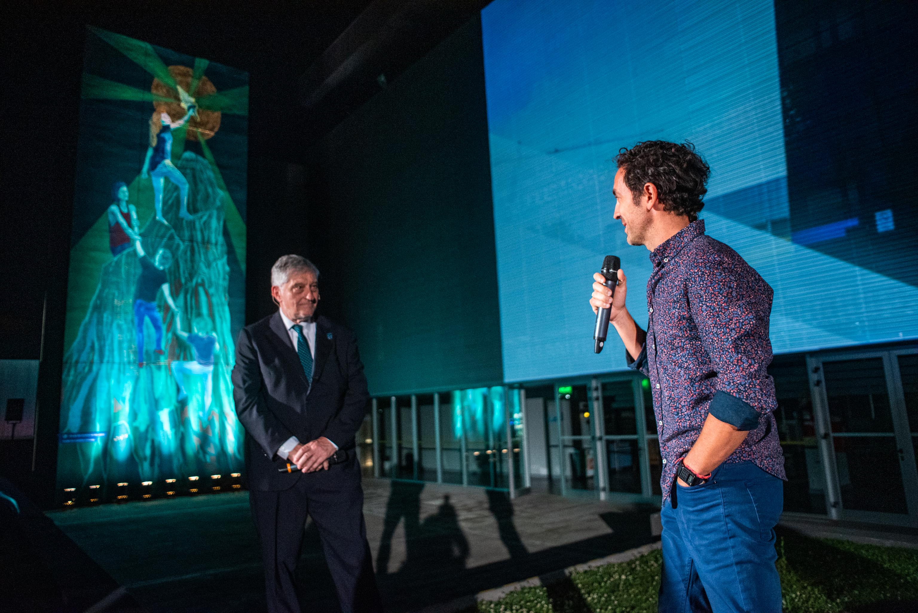 “El ITBA fue mi segundo hogar por muchos años, donde me formé e hice muchas amistades que todavía perduran, 20 años después. Me abrió muchas puertas y dio excelentes herramientas para mis proyectos en lo personal, artístico y profesional. Estoy muy feliz y agradecido que una obra mía ahora quedará en el ITBA. Me siento como un graduado más sumando mi energía a esta increíble comunidad cada vez más global”. Las palabras de Agustín Di Luciano resumen el orgullo de haber plasmado su arte en una de las paredes de la Universidad, más precisamente en una de las caras de la Sede Distrito Tecnológico, el moderno edificio de Parque Patricios, el espacio en el que se llevó a cabo la celebración del 60 aniversario. Y donde se hizo la presentación de “Historia Épica”, el mural que el graduado de la Promoción 41 (2005) creó especialmente para la conmemoración.