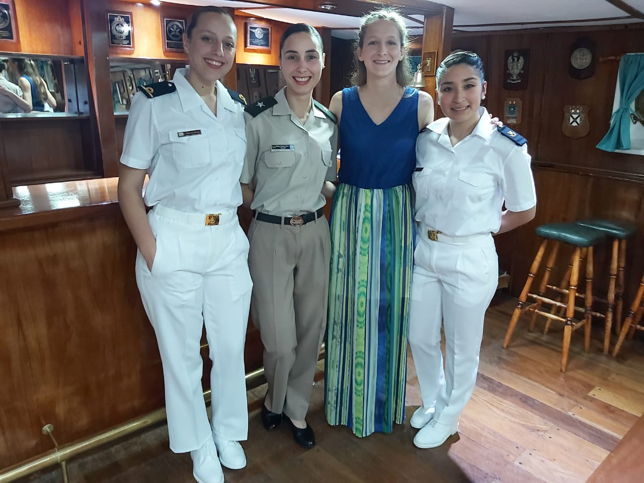 -Nos levantan a las 7 de la mañana, ahí ordenamos nuestras cosas y desayunamos, y a las 8 tenemos que formar en la cubierta. Después, los guardiamarinas ocupan sus respectivos cargos, y junto con las demás invitadas colaboramos en algunas tareas.  Por lo general a las 5 de la tarde los guardamarinas se liberan de sus cargos. Ahí se arman distintos grupos que juegan a las cartas o algún juego de mesa, mientras que otros están con la play station o la compu. También hay un TV, así que vemos películas. Los sábados que navegamos tenemos la noche de karaoke, ponen música y cantamos.