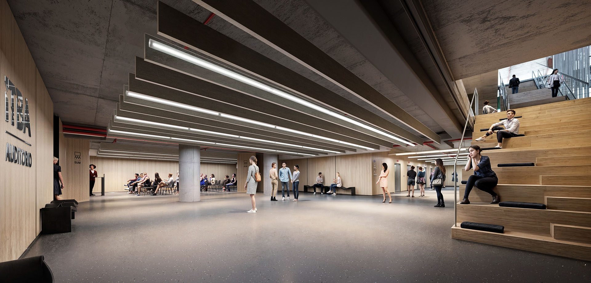 El ingreso a la institución será a través de un boulevard que atravesará todo el eje central del edificio, una pieza horizontal que vincula y organiza el ingreso tanto desde la Avenida Udaondo como desde el parque central del Parque de Innovación. Un espacio de ambigua condición interior/exterior que conecta con la circulación vertical del resto del edificio.