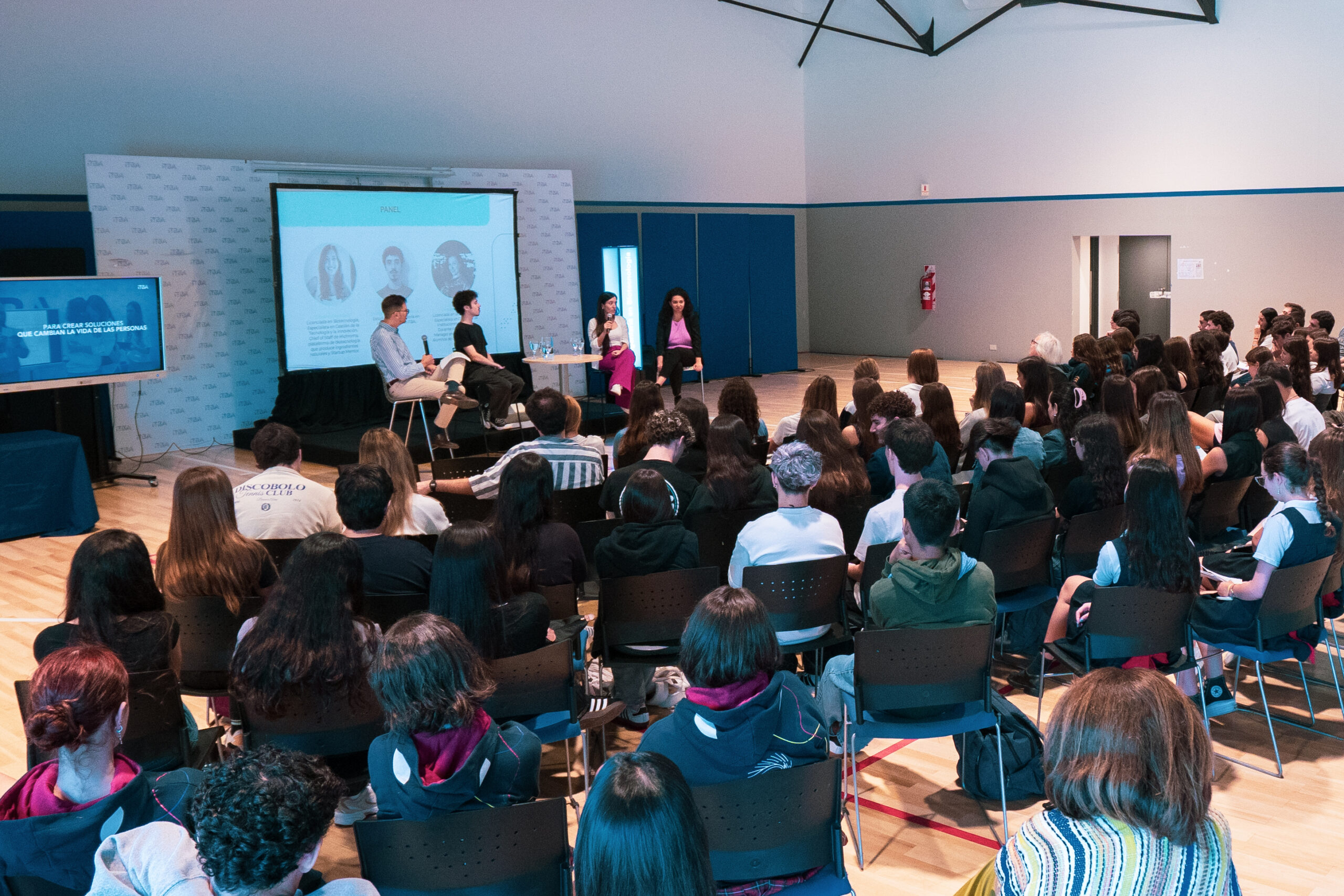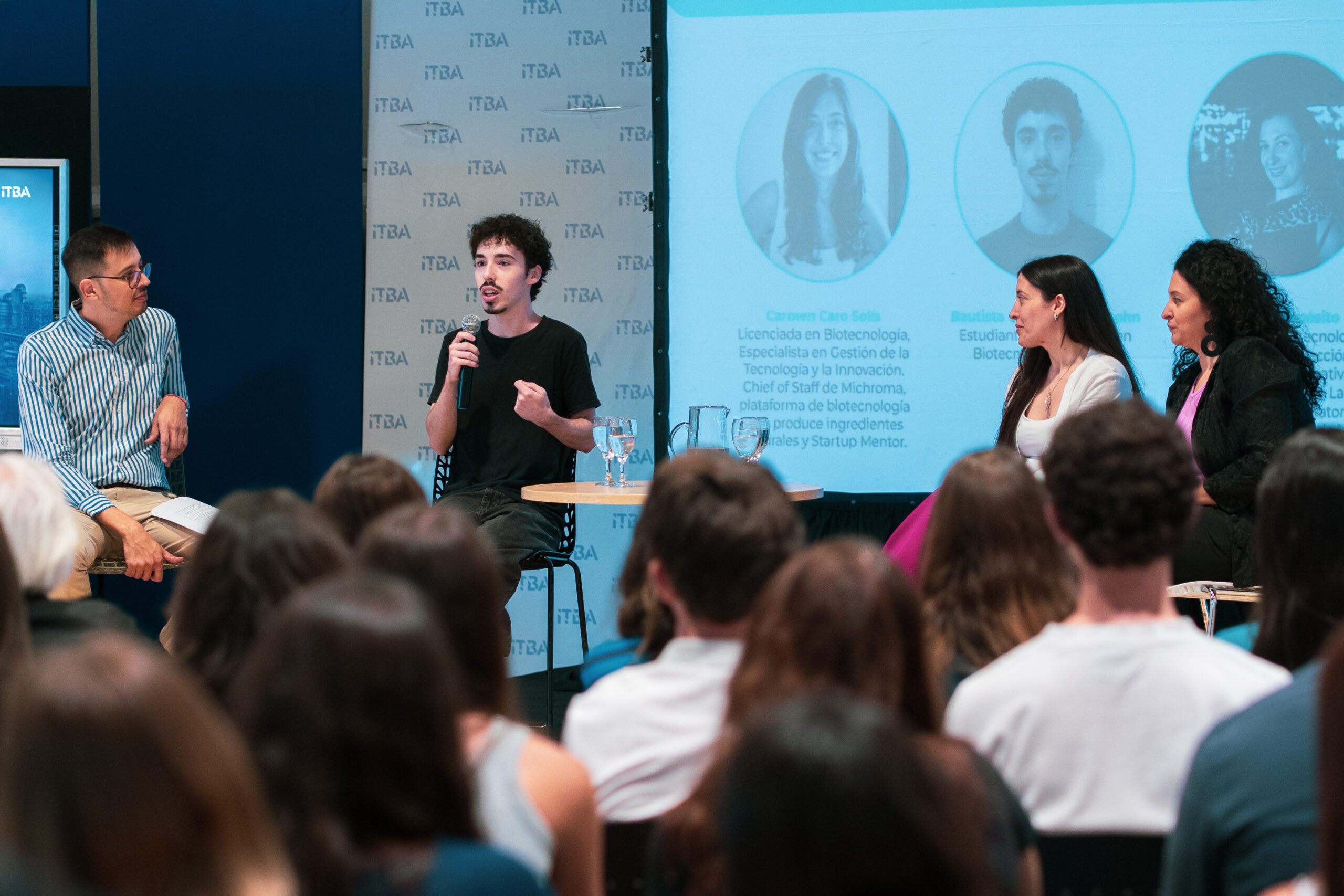 El evento cerró con un panel que reunió tres perspectivas del mismo campo. Giuliana Espósito, Licenciada en Biotecnología, docente del ITBA y Labs Manager del Laboratorio de Alumnos de Ciencias de la Vida, y Carmen Caro Solís, Licenciada en Biotecnología y Chief of Staff de una startup que produce ingredientes naturales mediante biotecnología, compartieron sus trayectorias y los desafíos del recorrido formativo. Bautista Galanes Scheinsohn, estudiante de la carrera, aportó la perspectiva de quien recién inicia el camino en la disciplina.