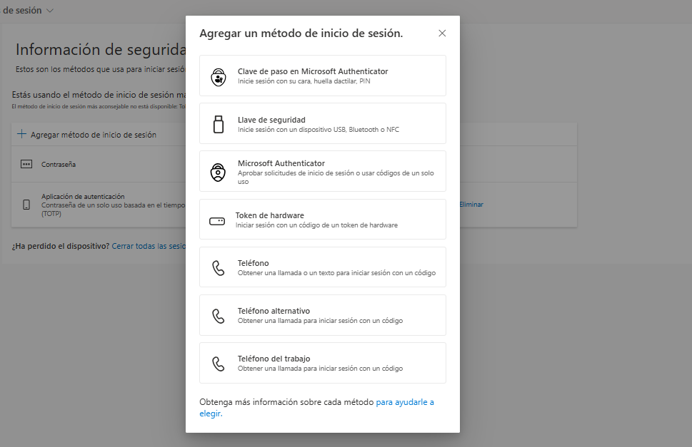 Luego, en información de seguridad hay que pulsar Agregar método de inicio de sesión. SI en la primer configuración se configuro la verificación por la aplicación se puede incorporar como segundo método de inicio de sesión el passkey