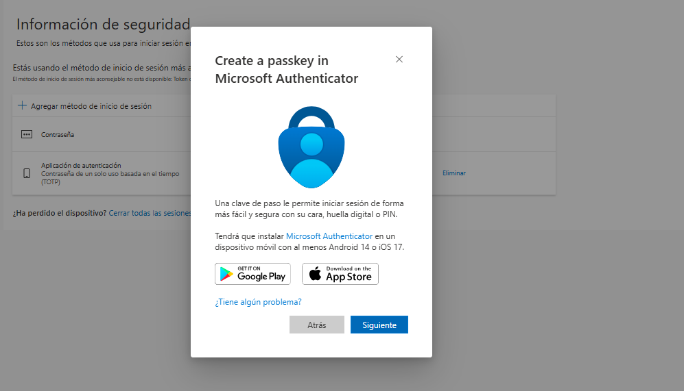Luego tendremos el alerta de que se creará un passkey. Pulsamos siguiente.