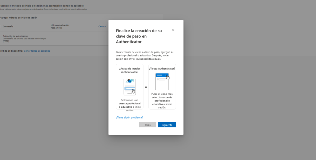 Antes de continuar hay que configurar la clave de paso en Microsoft Authenticar. Para eso, hay que seguir los siguientes pasos: Ingresar a Microsoft Authenticator > Pulsar el correo electrónico institucional > Crear una clave de paso > iniciar Sesión y seguir los pasos para la creacion de la clave de paso.