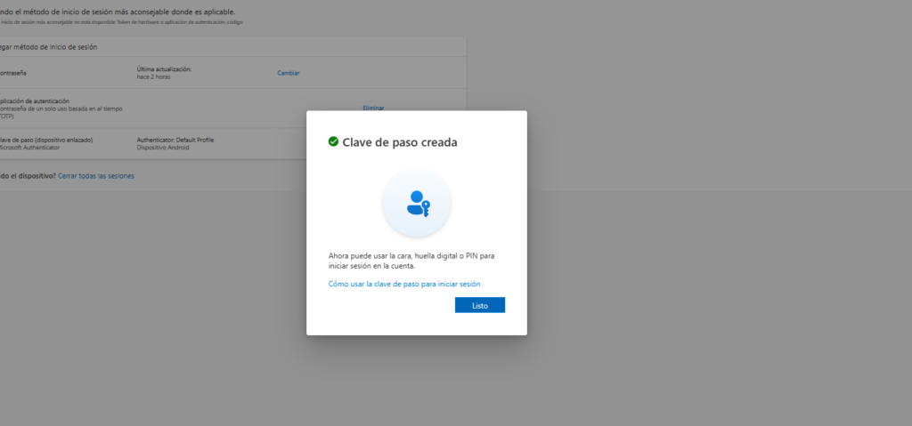 Luego, pulsamo Clave de paso en Microsoft Authenticator