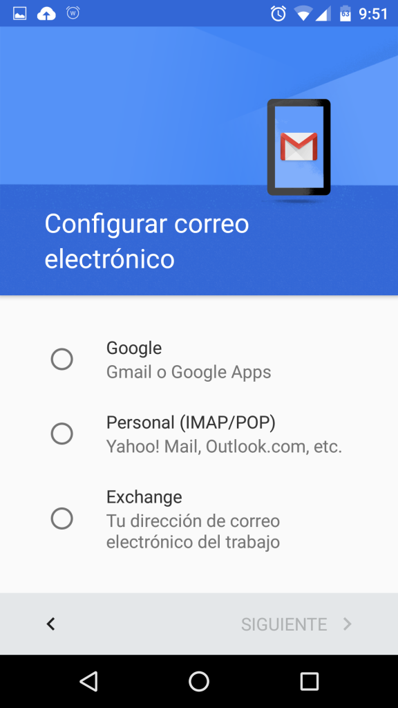 Seleccionamos la primera opción (Gmail o Google Apps) y en las pantallas siguientes vamos a irintroduciendo los datos que nos piden (dirección de correo y contraseña) y aceptamos las condiciones del servicio.