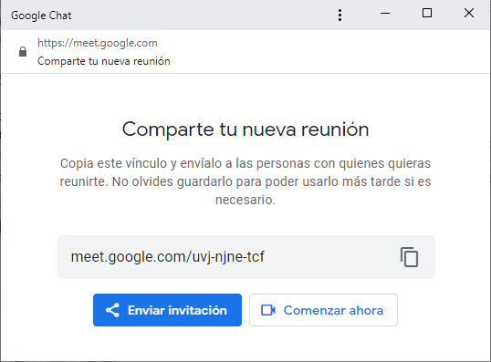 - En Nueva reunión, se visualizará el link de la reunión y la posibilidad de compartirla con otros usuarios.