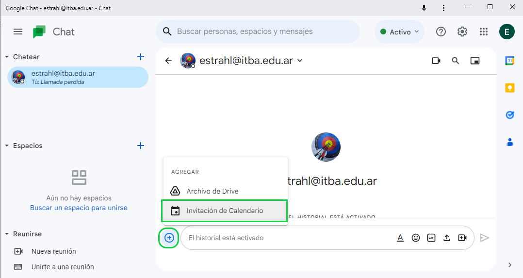 - Al hacer clic en el + a la izquierda de la barra de escritura se despliega la opción de “Invitación de calendario”, desde la cual en la misma ventana del chat se puede calendarizar una reunión.