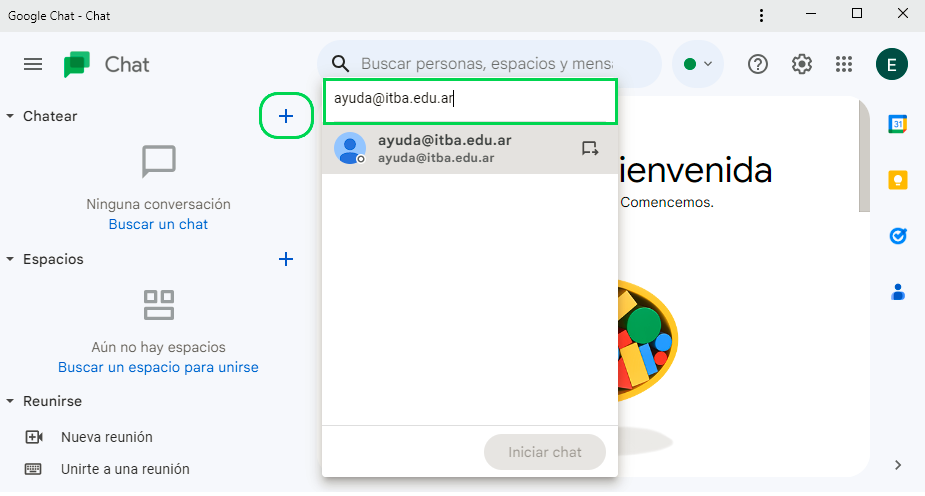 Para buscar un contacto se puede buscar por dirección de mail, nombre o apellido en el signo “+” que se marca en la siguiente imagen: