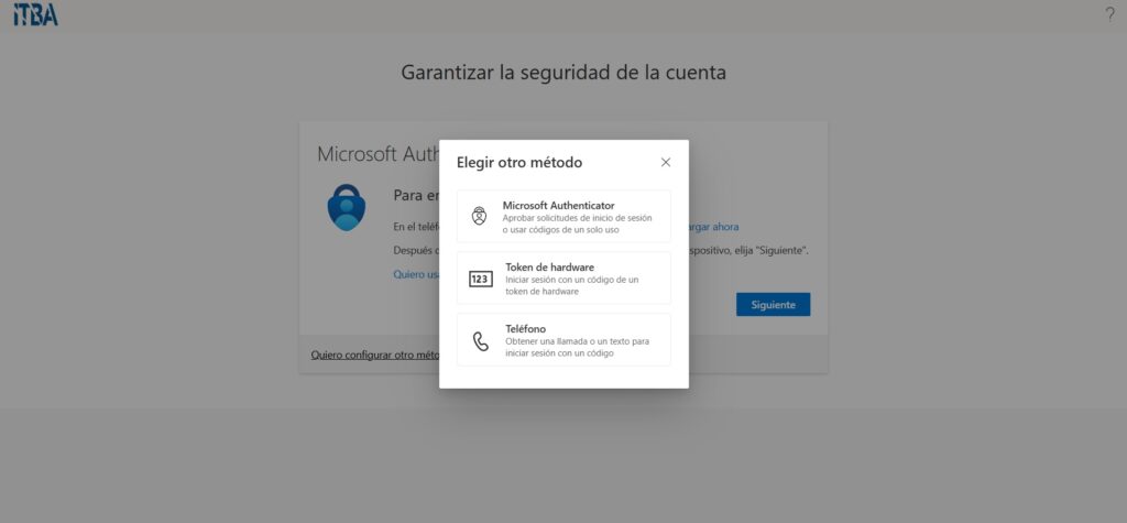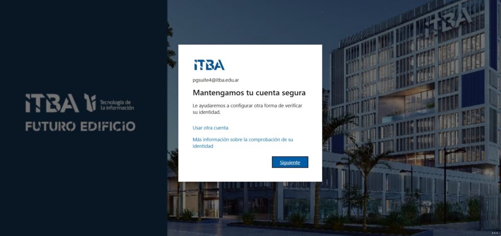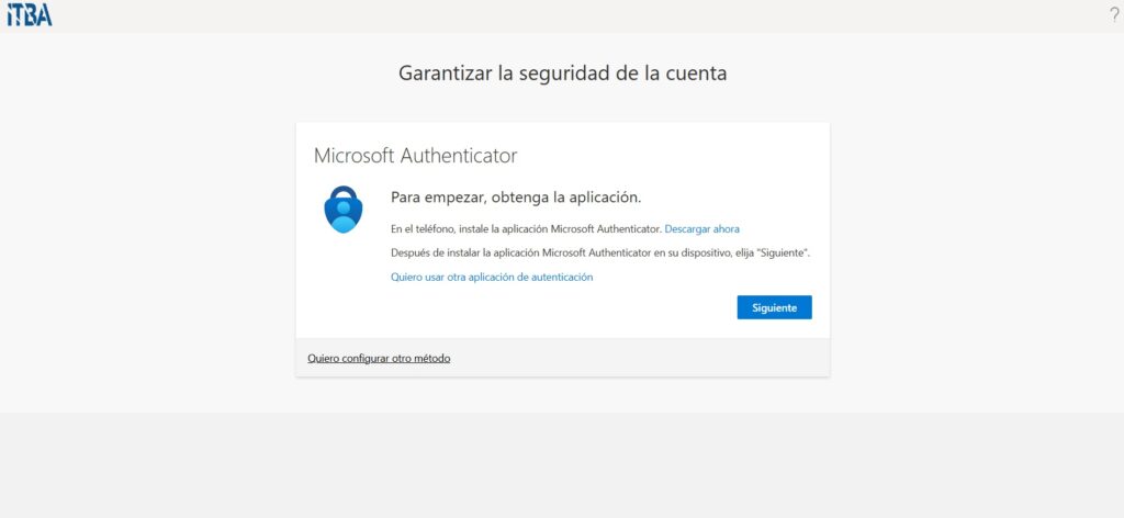 Luego nos llevará a garantizar la seguridad de la cuenta. Previamente se recomienda tener instalado Microsoft Authenticator en su versión para Android o ioS. Recuerden descargarlo de tiendas oficiales. Pulsamos siguiente.