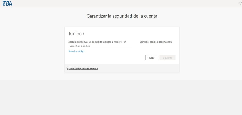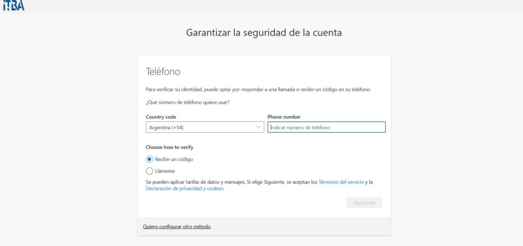 Luego, pulsamos clic en Quiero configurar otro método y seleccionamos la opción Teléfono.