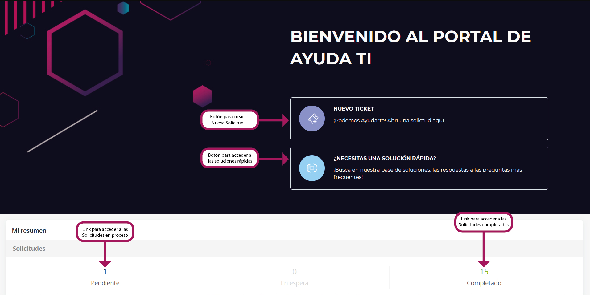 4. Una vez hecho esto podes ingresar al Portal y ver todos tus solicitudes, crear nuevas o ver los articulos de las Soluciones Rápidas