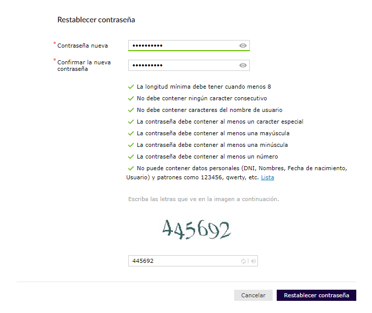 Luego del paso anterior, ingresamos la nueva contraseña cumpliendo con los estándares. El color verde indica que la contraseña cumple con los requisitos mínimos de seguridad. Completamos el captcha.