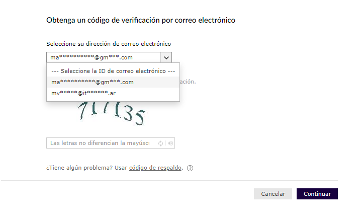 Luego, tenemos que seleccionar uno de los correos electrónicos registrados para la recuperación de nuestra contraseña. Una vez seleccionado, escribimos el captcha y al continuar se nos enviará un código de verificación al correo seleccionado.