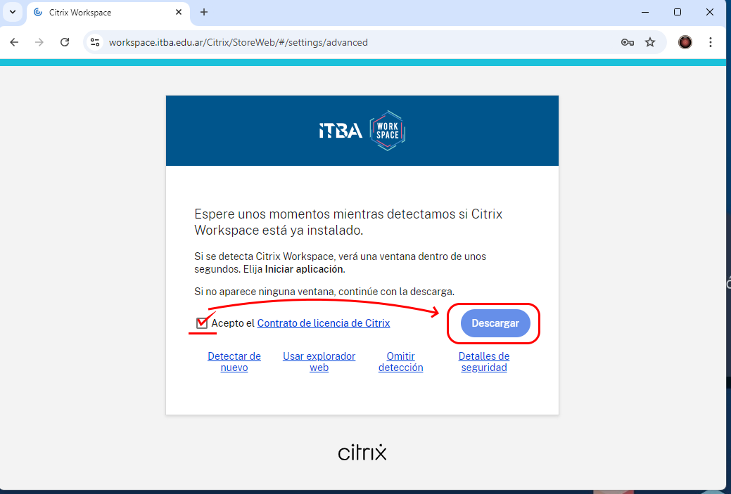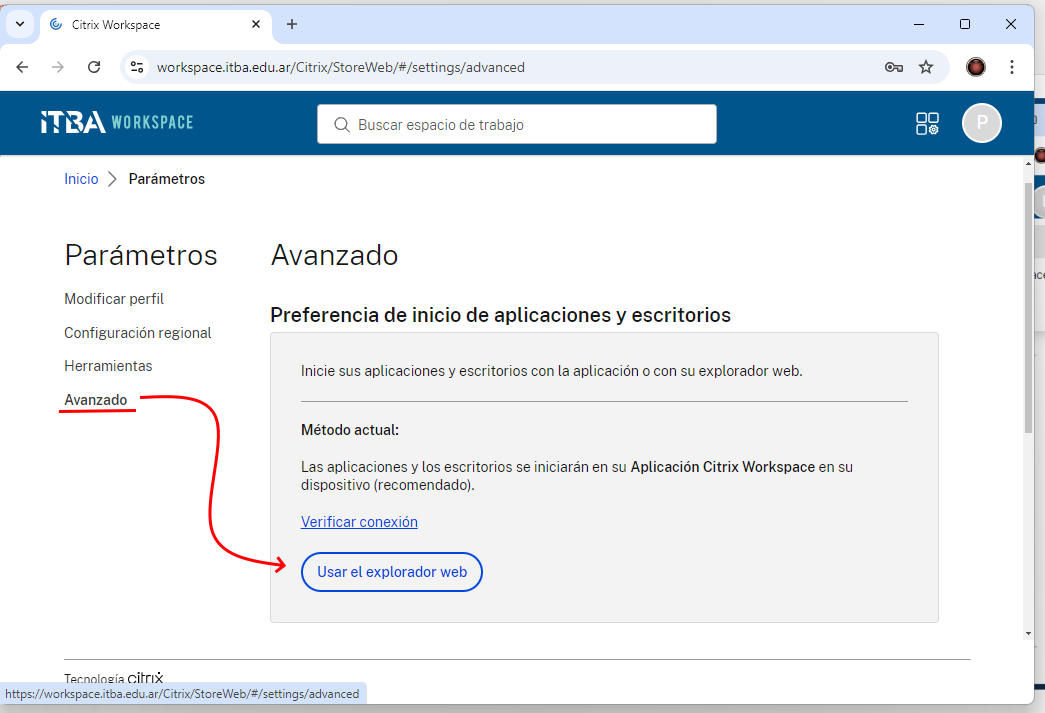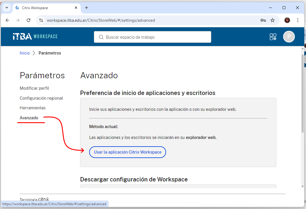 - Luego dentro de la opción Avanzado hacer click en Usar la aplicación de Citrix Workspace.