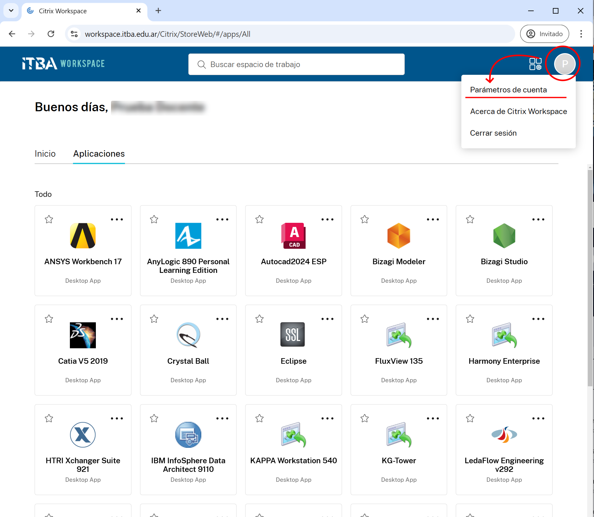 - Podes hacerlo entrando a workspace.itba.edu.ar ingresando tu usuario completo y tu clave. Recordá que tu usuario debe llevar @itba.edu.ar al final.