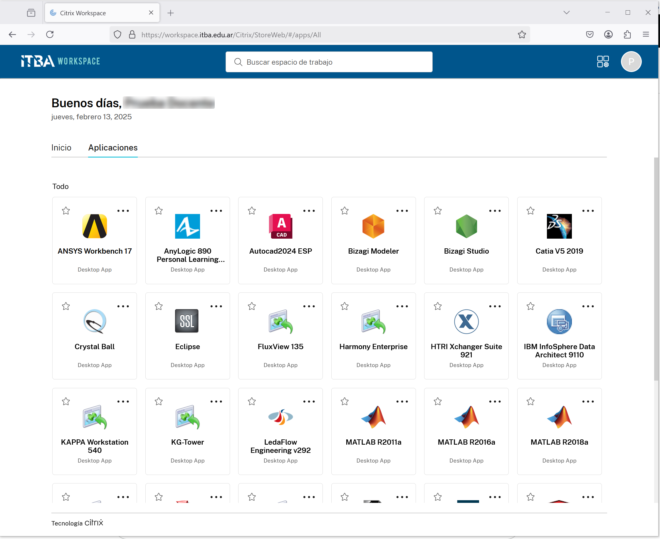 - Al ingresar a Workspace con tu usuario y contraseña ITBA. Vas a ver todas las aplicaciones instaladas
