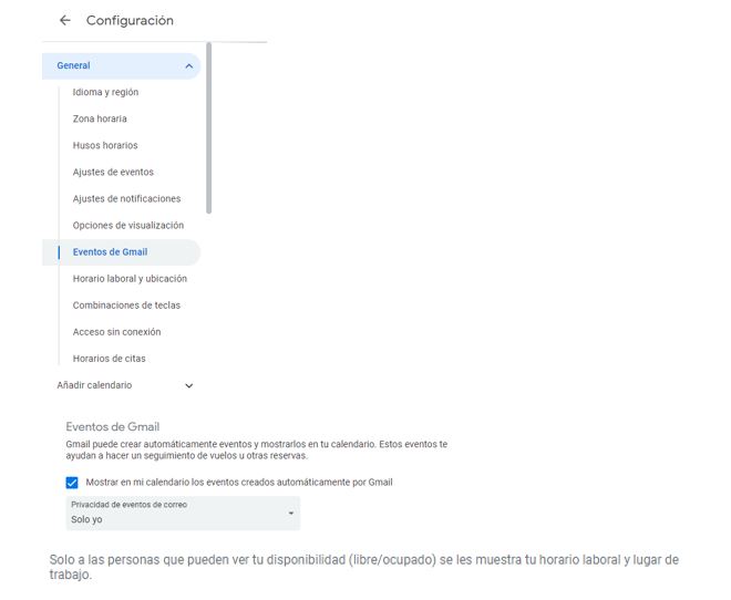 - Hace clic en eventos de gmail, allí podrás configurar la privacidad de la visibilidad (en el caso que sea privada, la disponibilidad se indicará como libre/ocupado)