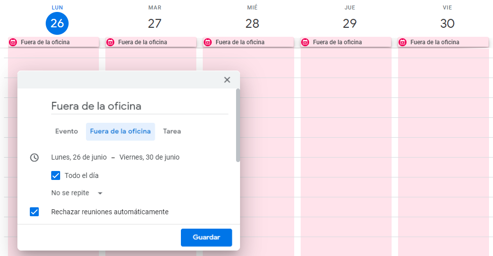 3. Una vez seleccionada la opción fuera de oficina, configurar la fecha, hora y hacer clic en guardar.