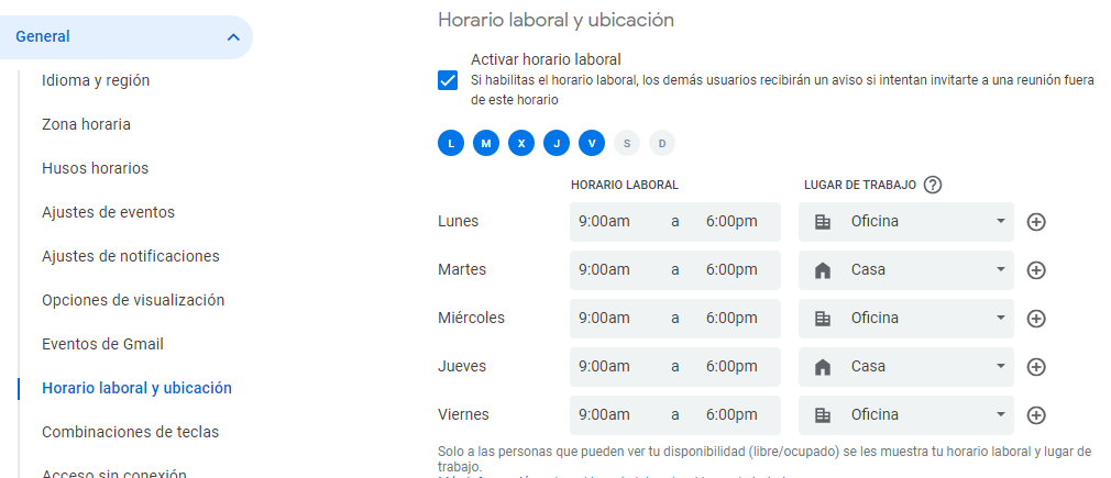 - Hace clic en horario laboral y ubicación, allí podrás configurar día, horario y lugar de trabajo.