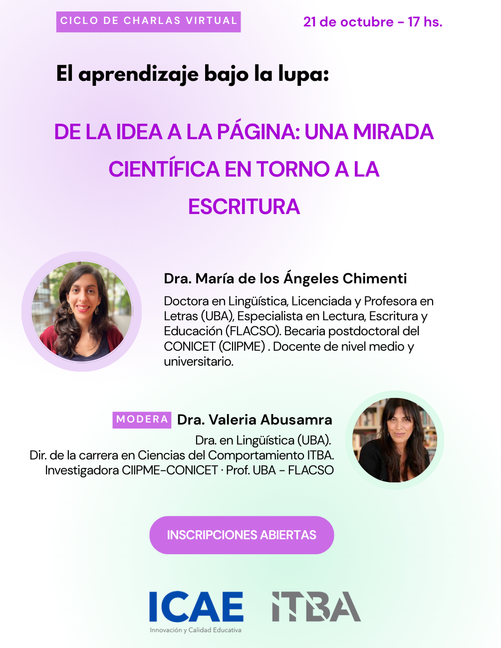 ICAE, junto con expertos de la nueva carrera de Ciencias del Comportamiento, te invitan al ciclo de charlas virtuales donde se abordarán las principales problemáticas y desafíos vinculados con la lectura, la escritura, la comprensión y la producción de textos en el Nivel Superior.