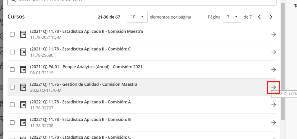 Paso 2: Luego, hay que seleccionar el curso de origen de contenidos para realizar la copia. Haciendo un check del curso y luego se pulsa la flecha.