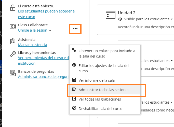 Paso 1: Dentro del curso ir a los tres puntos, luego pulsar administrar todas las sesiones.