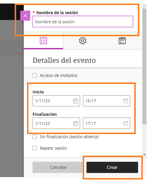 Paso 3: Ingresar el nombre de la sesión, fecha y hora de inicio y finalización. Luego pulsar crear. La sesión estará programada.